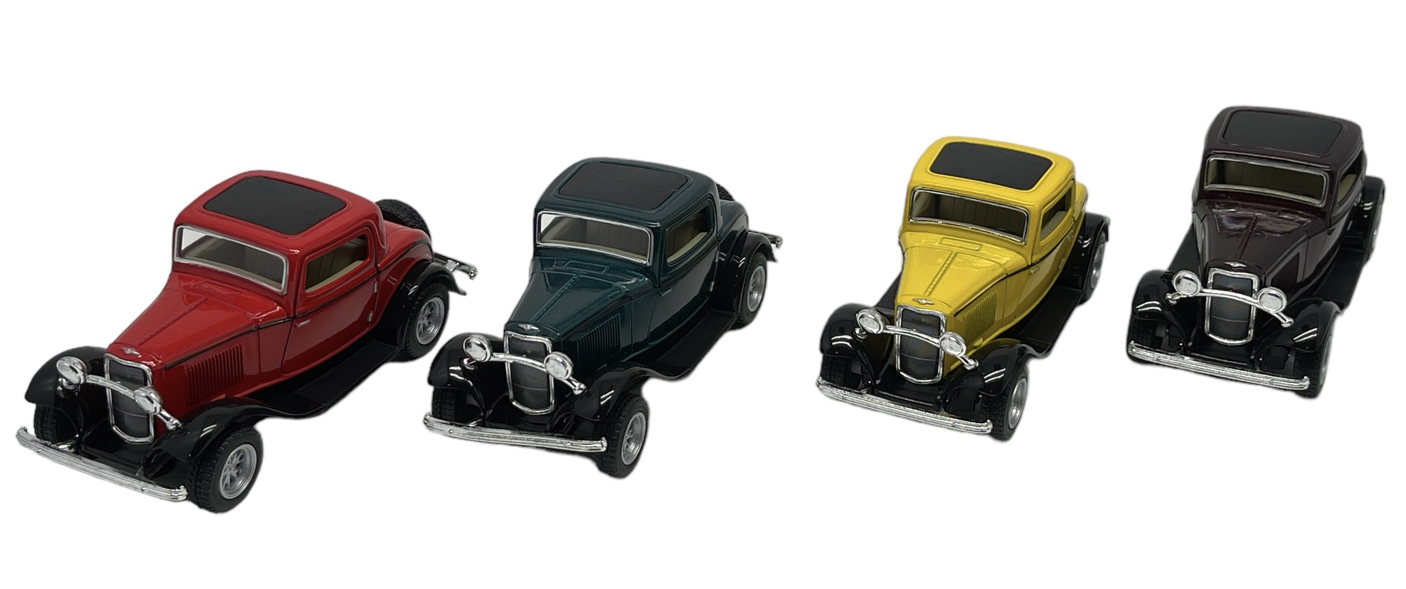 1932 Ford Coupe 1:36. Metallinen pienoismalli, jonka ovet aukeavat ja auton saa liikkeelle pull back-toiminnolla. Neljä eri väriä.