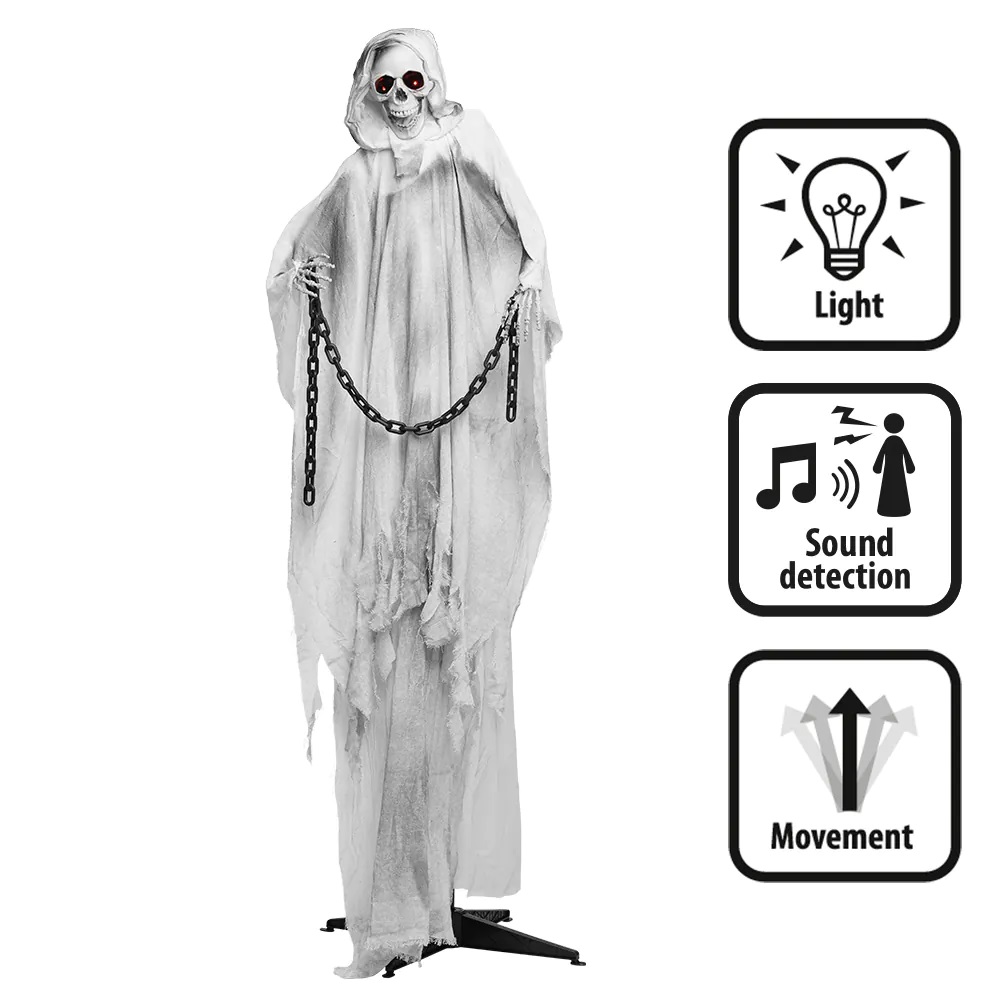Upeassa 190 cm:n mittaisessa aaveessa kaikki mehevät toiminnot luomaan kauhutunnelmaa. Aave havahtuu eloon kun saa tarpeekseen vallitsevista ihmisäänistä! Se alkaa huutaa tuskissaan karmivia ääniä, vääntelehtimään hurjana ja silmät alkavat vilkkua punaisena. Jos haluat muuttua heikkohermoiseksi, suosittelemme tätä tyyppiä kämppäkaveriksi !
