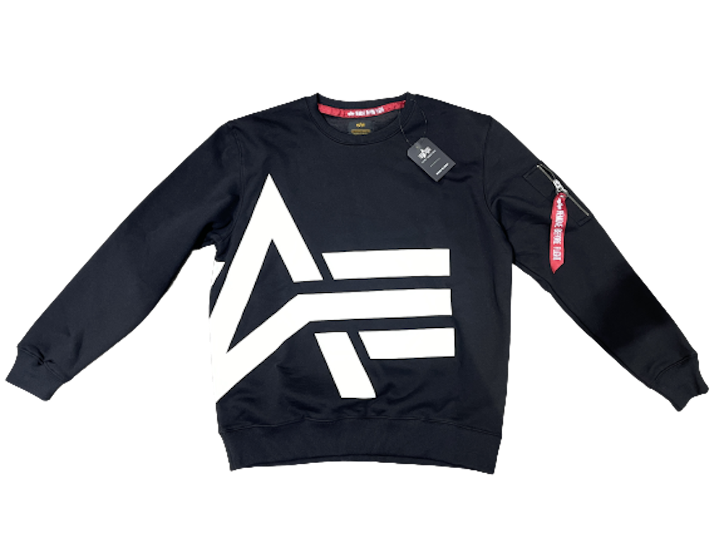 Alpha swetari isolla kylkipainatuksella. Musta collari jossa valkoinen sivu painatus.