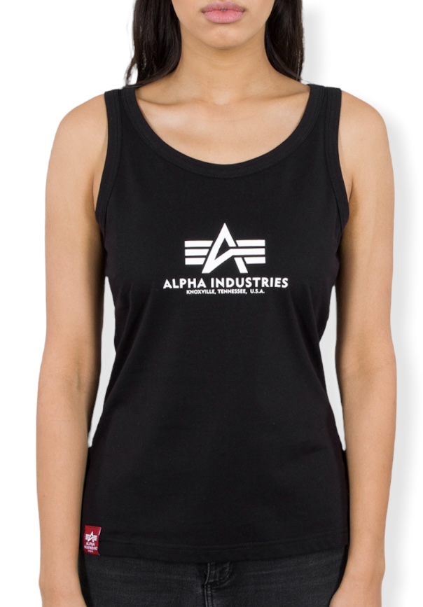 Alpha hihaton paita, musta. Naisten musta hihaton toppi, jossa edessä printattuna valkoinen Alpha Industries-logo. Materiaali 100 % puuvilla.