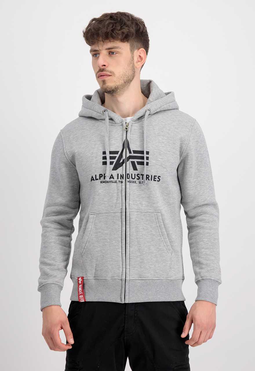 Alpha Huppari Grey Heather. Meleerattu vaaleanharmaa ketjullinen huppari mustalla logoprintillä. Materiaali 80 % puuvilla, 20 % polyesteri.