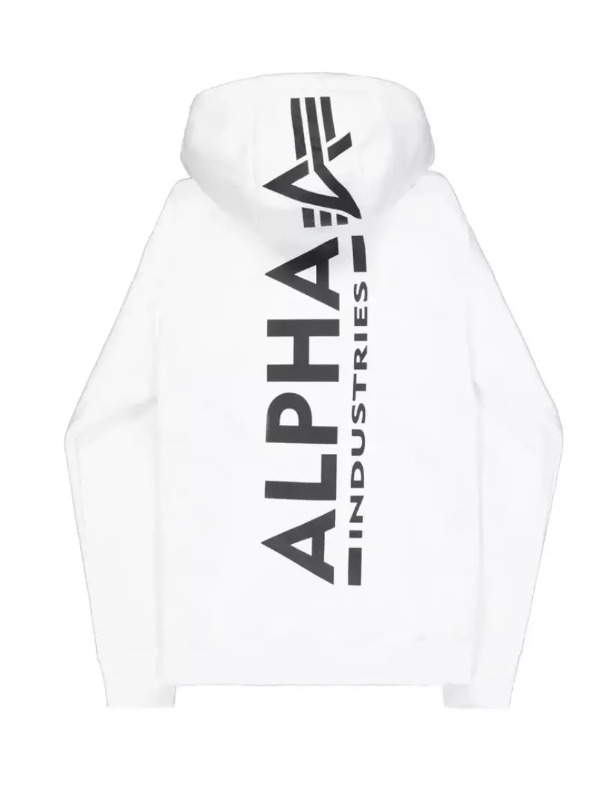 Alpha-huppari takaprintillä, valkoinen. Rento vetoketjullinen huppari. Materiaali 80 % puuvillaa ja 20 % polyesteria.