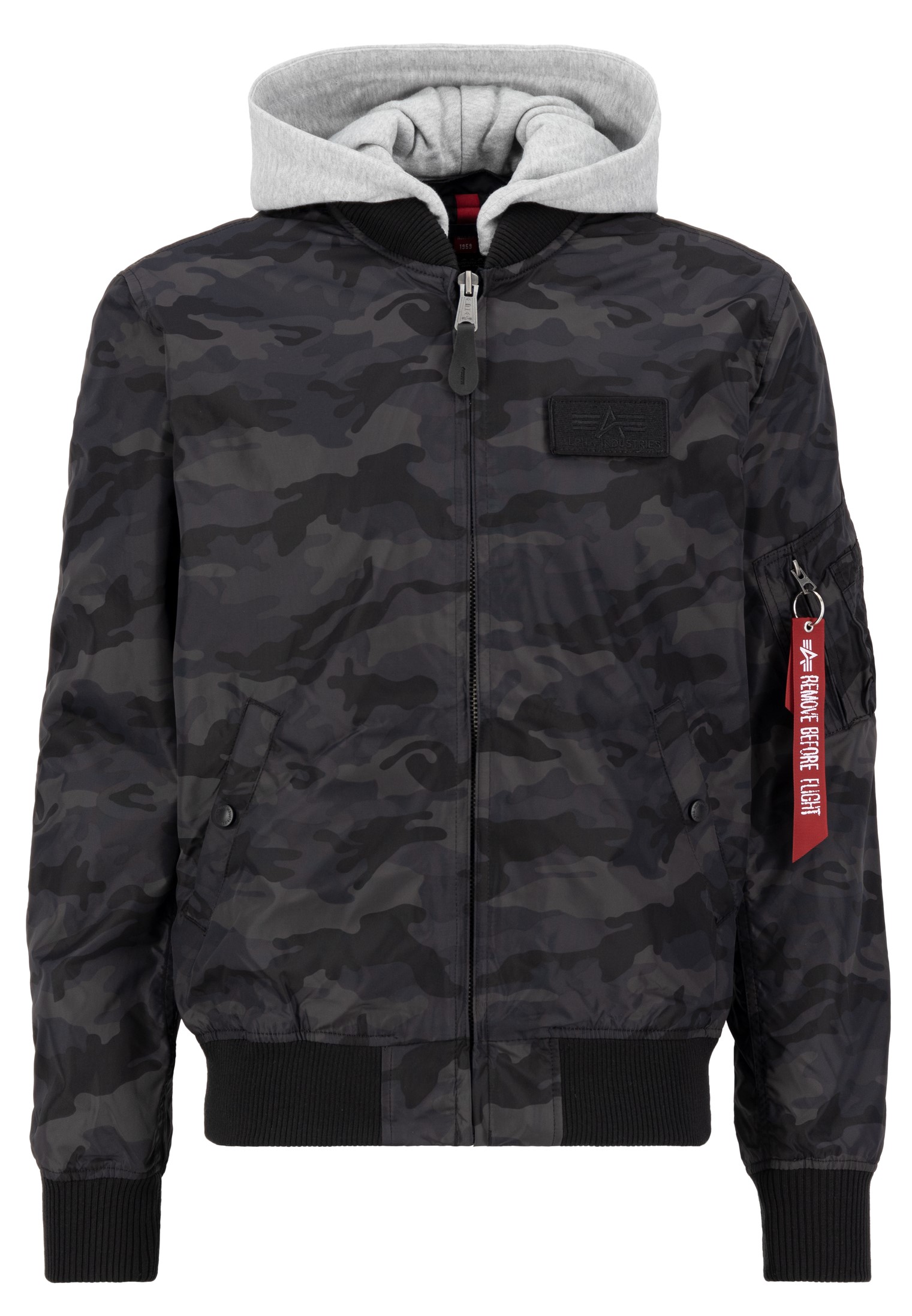 Alpha Industries pilottitakki hupulla. Mustaharmaa camo-kuosinen ohutvuorinen pilottitakki, jossa harmaa vetoketjulla irroitettava college-huppu.