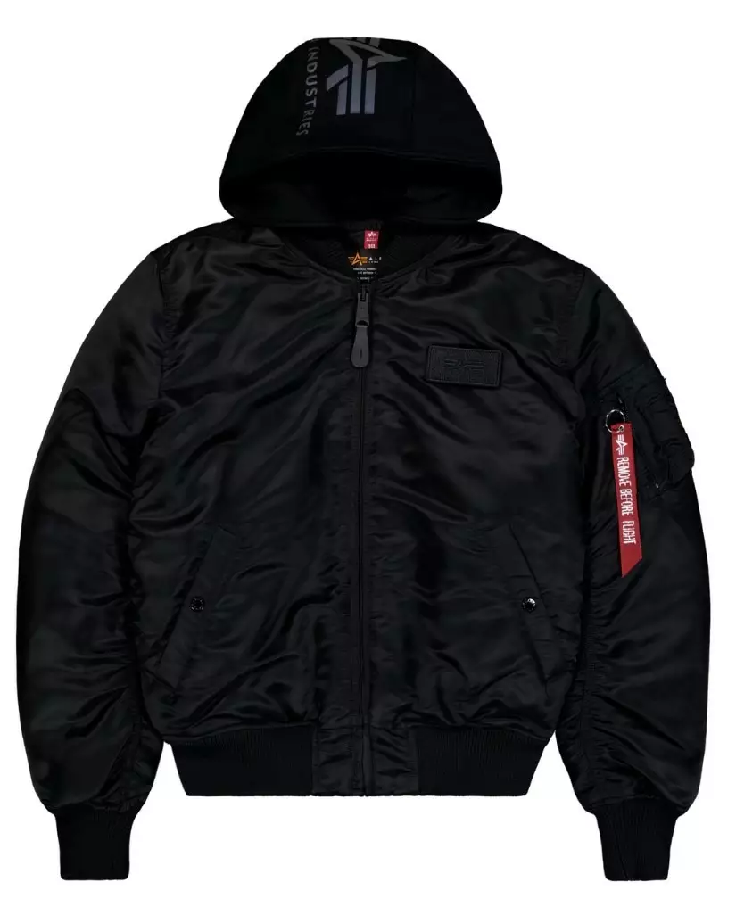 Selässä ja hupun päälliosassa iso heijastinteksti ALPHA INDUSTRIES. Irtohuppu vetoketjukiinnityksellä. Edessä listataskut neppareilla, ja vasemmassa hihassa pieni vetskatasku, jossa lisäksi päälleommellut kynätaskut. Helmassa, pääntiellä sekä hihansuissa resorit. Vuorissa nepparilliset povarit molemmilla puolilla.