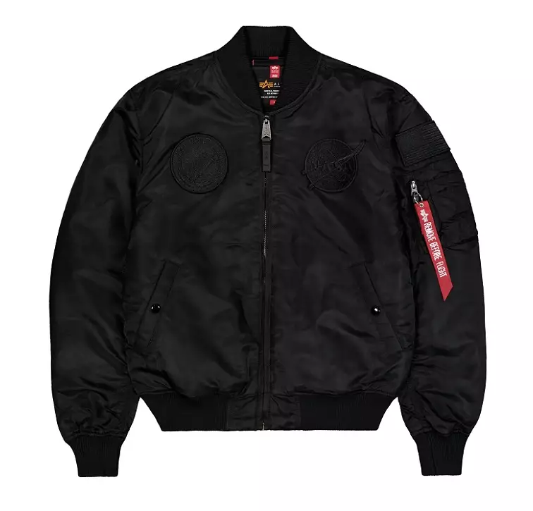 Alpha Pilotti MA-1 VF Nasa, Vintage fit. Musta pilotti kokomustilla Nasan brodeeratuilla, irroitettavilla merkeillä.