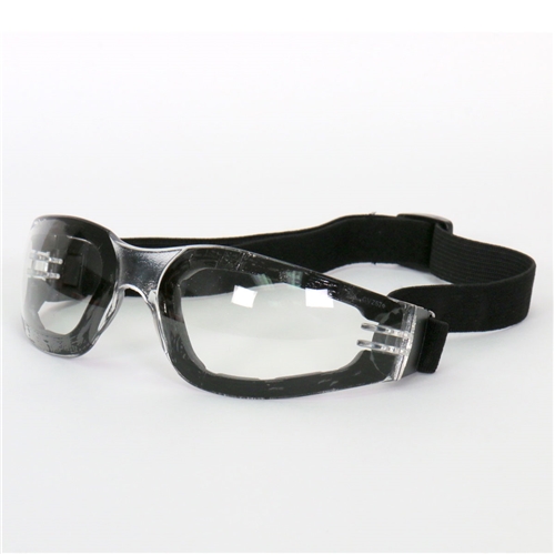 MOTORCYCLE SAFETY SUNGLASSES Meets ANSI Z87.1-2010 Standards for use in Industrial Applications Shatterproof Polycarbonate Lenses UV400 Filter for Maximum UV Protection Scratch Resistant Coating Matte Black Frames Thin, Flexible Black Strap Vented EVA Foam Clear or Smoke or Yellow Tint Lenses