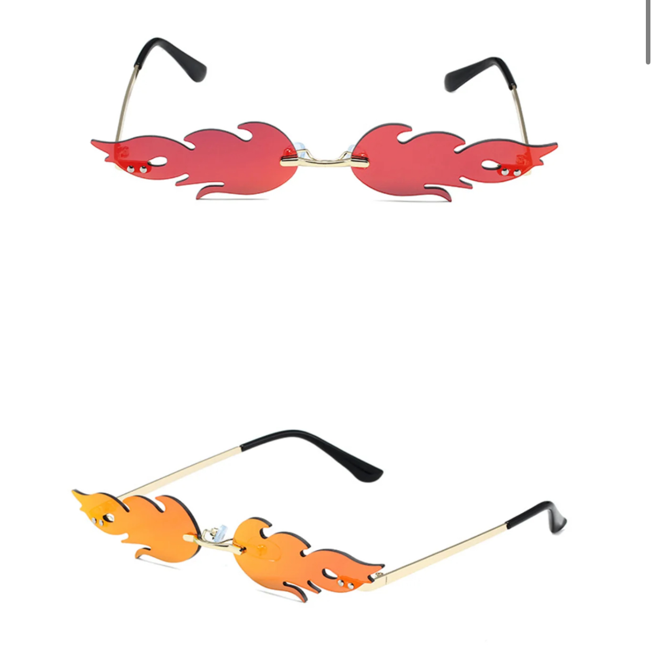 Aurinkolasit Liekki, pun. peililasi. Hauskat lasit, joissa matalat liekinmalliset peililinssit. Väri punainen, mutta eri suunnista katsottaessa värin vaikutelma vaihtelee. Liekin koko n. 70 mm x 25 mm.