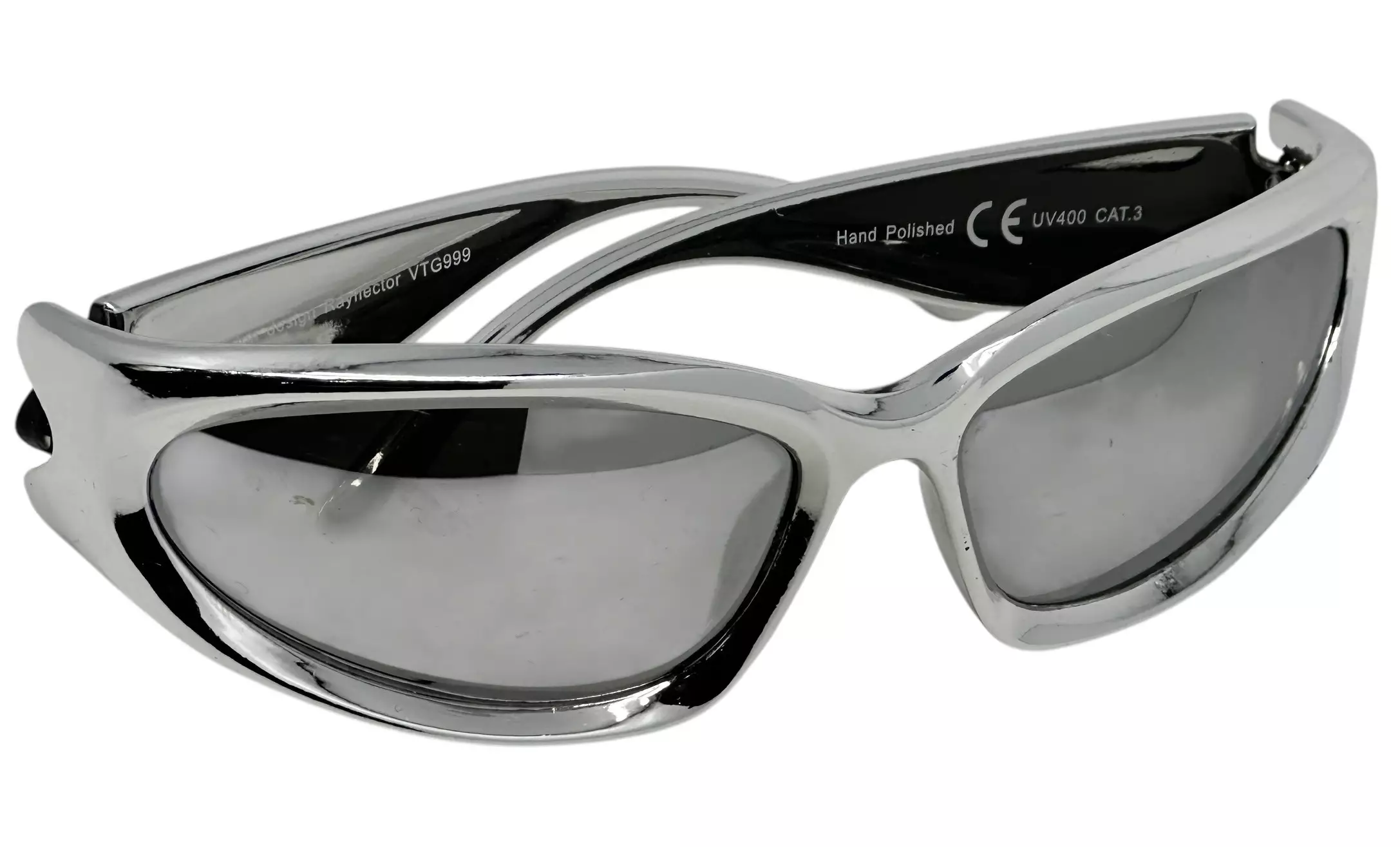 Aurinkolasit Peililinssi kromi. Muoviset kiiltävät krominväriset kehykset, joissa tummat peililinssit.