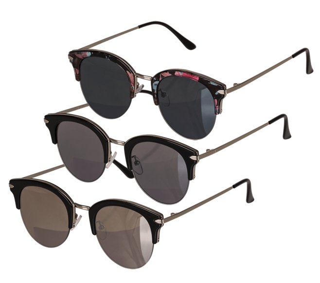 Aurinkolasit. Mustalinssi jossa punaisia kohtia yläkehyksessä. Harmaalinssi musta yläkehys. Ruskealinssi musta yläkehys