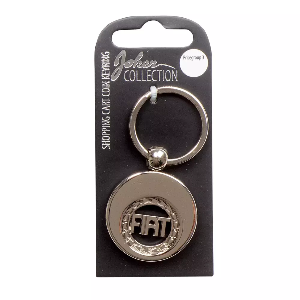 Avaimenperä Fiat. Kiiltävä, krominvärinen metalliavaimenperä, jossa ostoskärrypoletti. Avainrenkaan halkaisija 30 mm, automerkin halkaisija 35 mm.