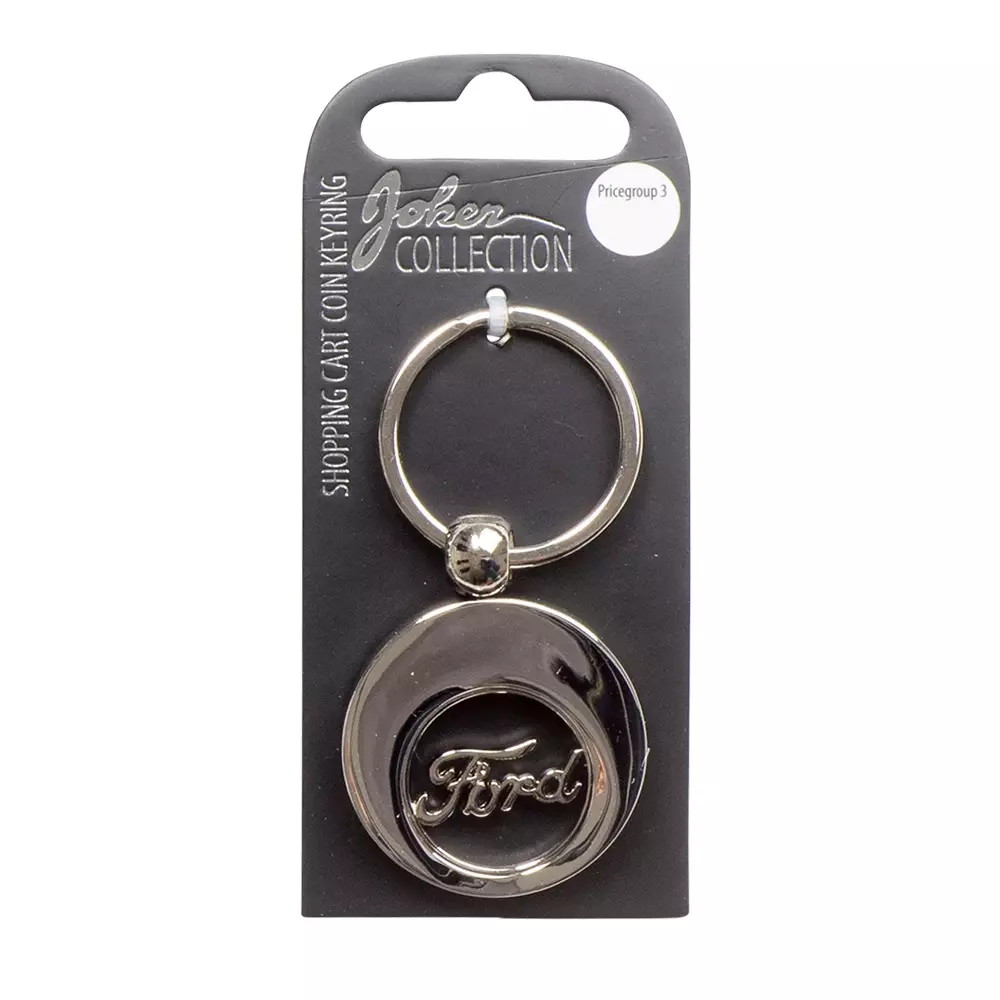 Avaimenperä Ford. Kiiltävä, krominvärinen metalliavaimenperä, jossa ostoskärrypoletti. Avainrenkaan halkaisija 30 mm, avaimenperän kokonaismitta n.70 mm.