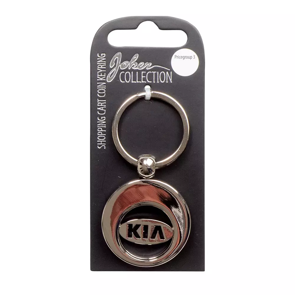 Avaimenperä Kia. Kiiltävä, krominvärinen metalliavaimenperä, jossa ostoskärrypoletti. Avainrenkaan halkaisija 30 mm, avaimenperän kokonaismitta n.70 mm.