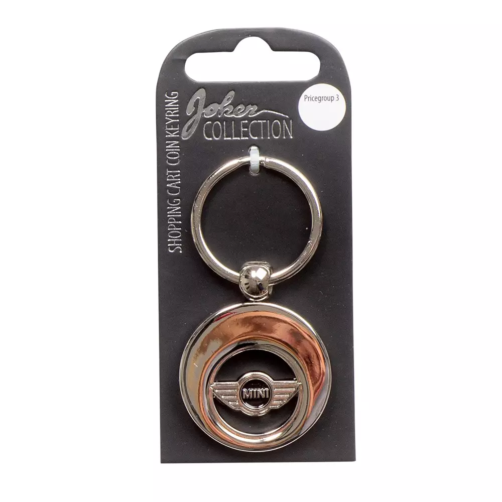 Avaimenperä Mini. Kiiltävä, krominvärinen metalliavaimenperä, jossa ostoskärrypoletti. Avainrenkaan halkaisija 30 mm, avaimenperän kokonaismitta n.70 mm.
