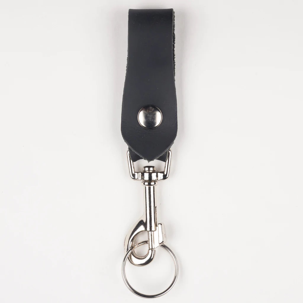 Avaimenperä vyöhön, musta. Nepparikiinnitteinen nahkalenkki, jossa metallinen papukaijaluko ja avainlenkki. Nahkalenkin pituus 90 mm ja hakoineen lenkkeineen koko pituus 17,5 cm. Mahtuu max 55 mm leveään vyöhön. Aitoa nahkaa, made in USA.