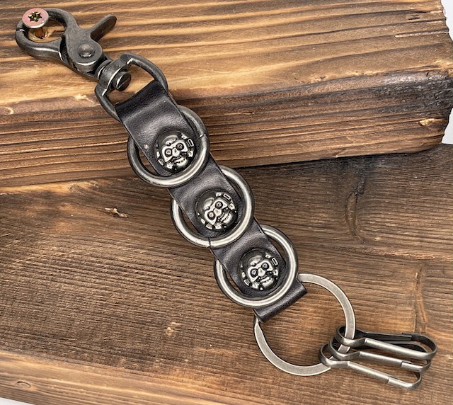 Avaimenperä musta nahka 3 pääkalloa Teräsosat mustacromia noin 19cm