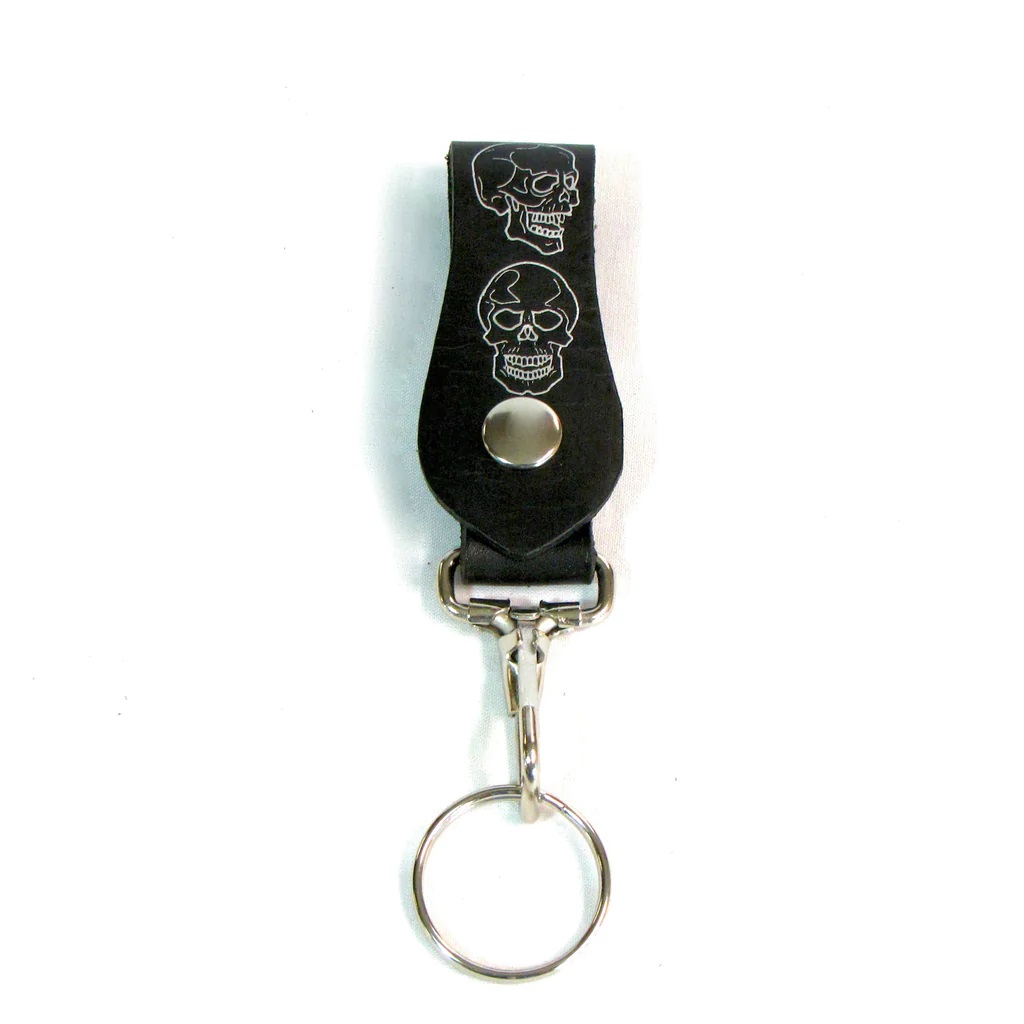 Avaimenperä musta nahka, kalloprintti. Nepparikiinnitteinen nahkalenkki, jossa hopeanvärinen pääkalloprintti. Lenkissä krominvärinen haka ja avainlenkki. Nahkalenkin pituus 95 mm ja hakoineen lenkkeineen koko pituus 16 cm. Aitoa nahkaa, made in USA.
