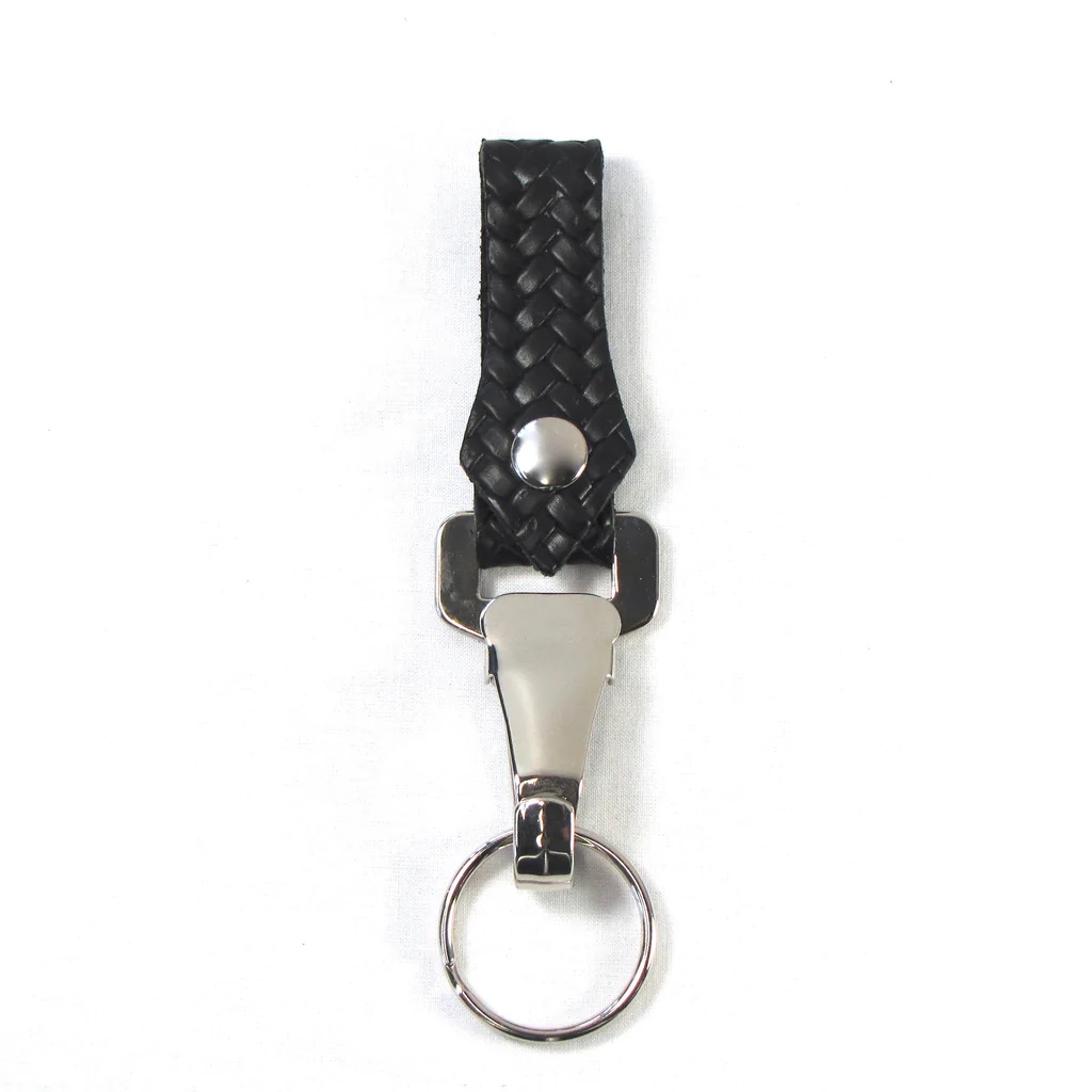 Avaimenperä musta nahka, Koripunos. Nahkaisessa vyölenkissä punosmainen pintakuviointi ja massiivinen kromihakanen avainlenkille. Avaimenperä on helppo laittaa vyöhön nepparin avulla. Vyölenkki mahtuu max. 50 mm leveään vyöhön. Nahkalenkin koko n. 25 mm x 90 mm ja koko avaimenperän mitta metalliosineen on 175 mm. Made in USA.