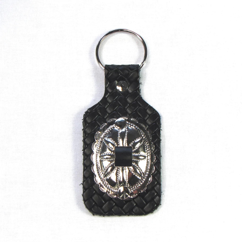 Avaimenperä, Ovaali Concho. Musta nahka, jossa punosmainen pintaviimeistely sekä krominvärinen metalliconcho. Nahkaosan mitat 45 x 95 mm, avainlenkin kanssa kokomitta 120 mm..