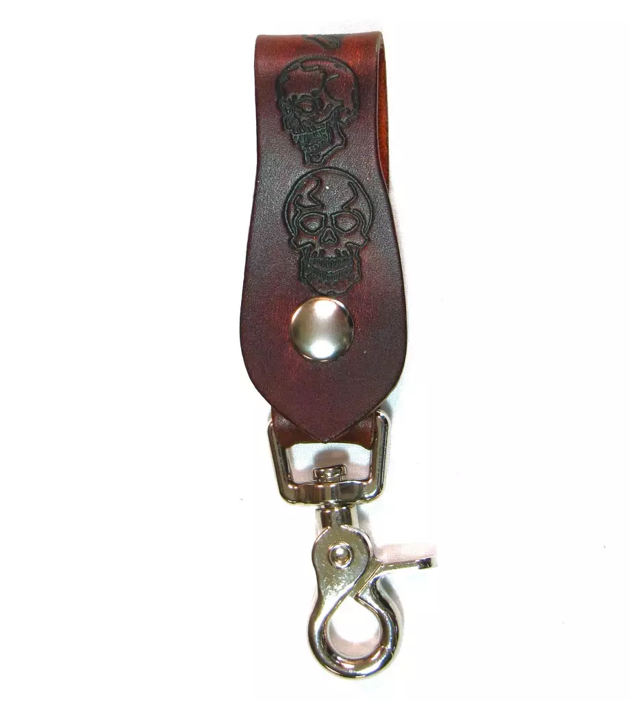 Avaimenperä ruskea nahka, kallot. Nepparikiinnitteinen nahkalenkki, jossa painetut pääkallot. Lenkissä krominvärinen haka. Nahkalenkin pituus 95 mm ja hakoineen koko pituus 14,5 cm. Aitoa nahkaa, made in USA.