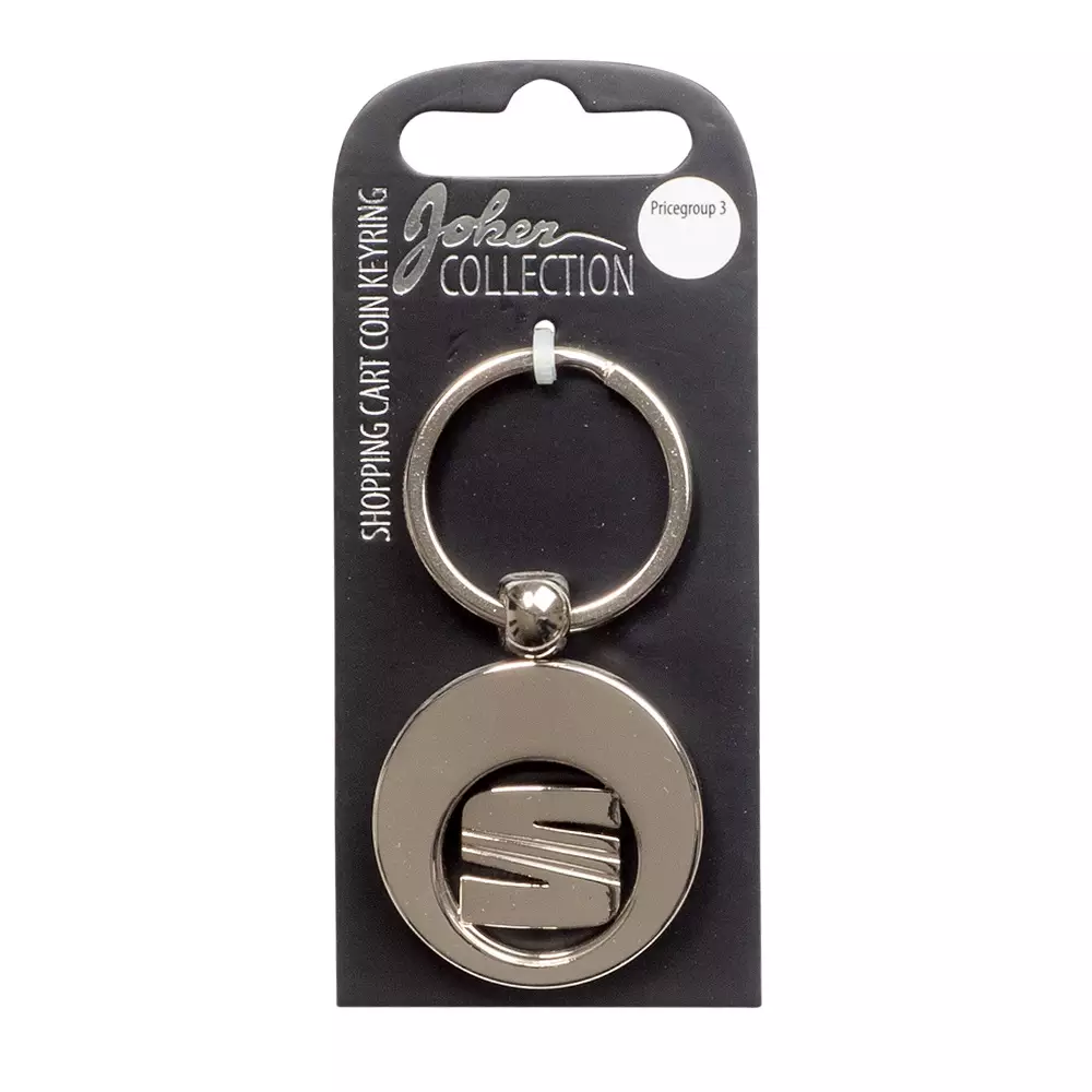Avaimenperä Seat. Kiiltävä, krominvärinen metalliavaimenperä, jossa ostoskärrypoletti. Avainrenkaan halkaisija 30 mm, avaimenperän kokonaismitta n.70 mm.