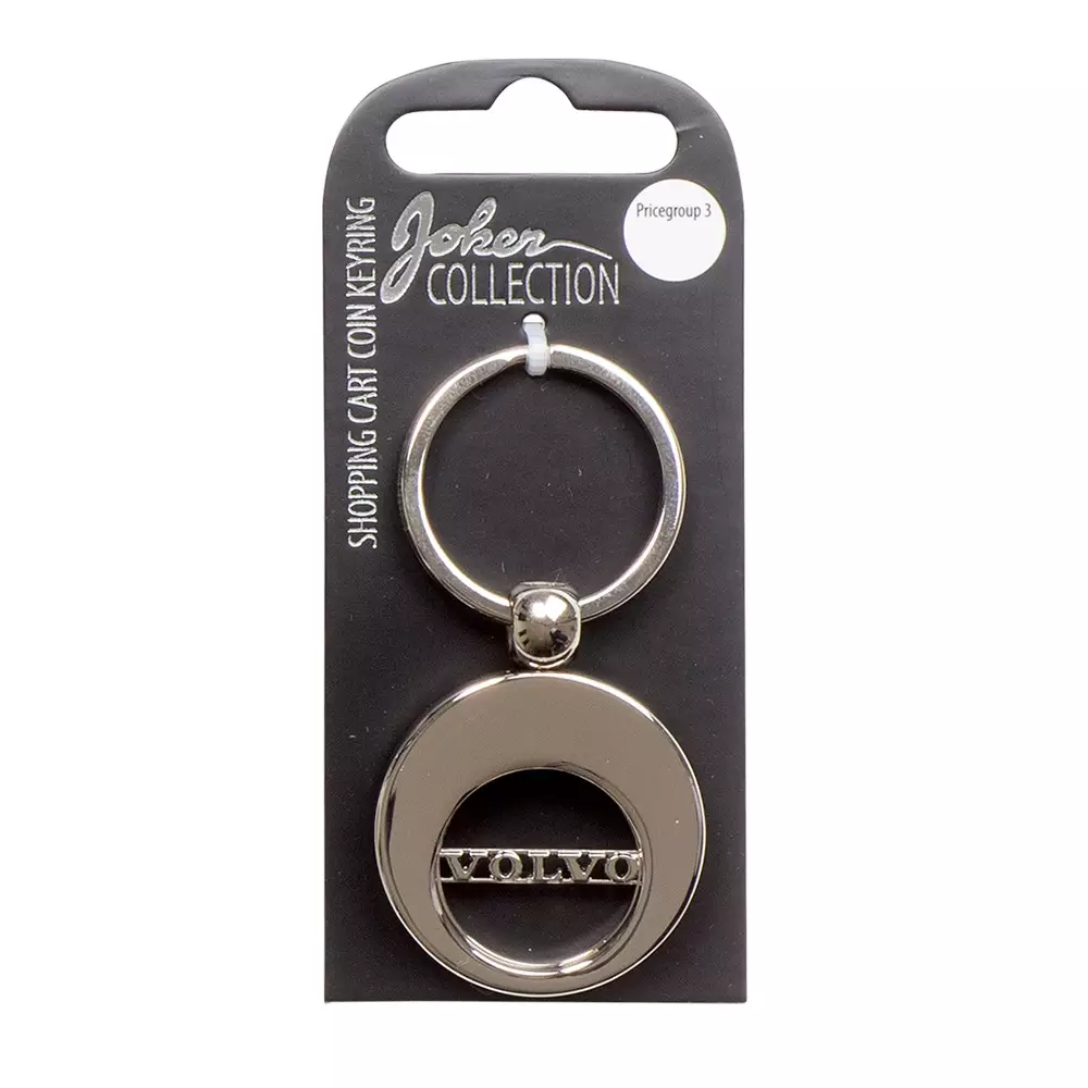 Avaimenperä Volvo. Kiiltävä, krominvärinen metalliavaimenperä, jossa ostoskärrypoletti. Avainrenkaan halkaisija 30 mm, avaimenperän kokonaismitta n.70 mm.