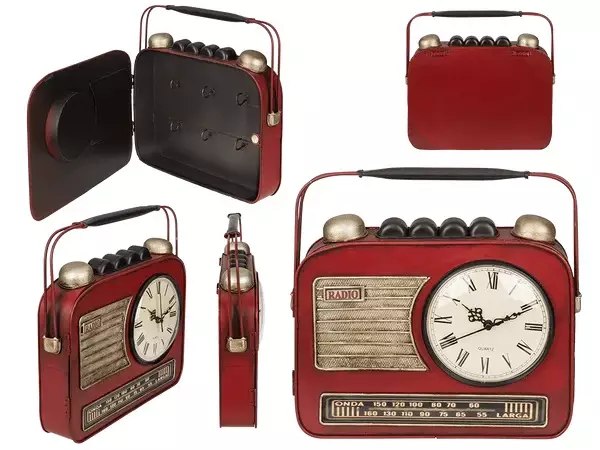 Avainkaappi/ kello, Radio. Metallinen, retroradion näköinen avainkaappi, jossa kello. Kello toimii yhdellä AA-paristolla (ei sisälly pakkaukseen). Mitat n. 29 x 28 x 7 cm