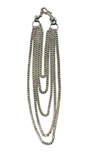 Avainketju 5-ketjua, 2-lukkoa. Pituus lukosta lukkoon avattuna lyhin ketju n. 45 cm. Lukot kiinni yhdessä, ketjut kaksinkerroin riiputettuna pituuus n. 42 cm pisimmän ketjun mukaan.Yhden ketjulenkin mitta n. 9 mm.