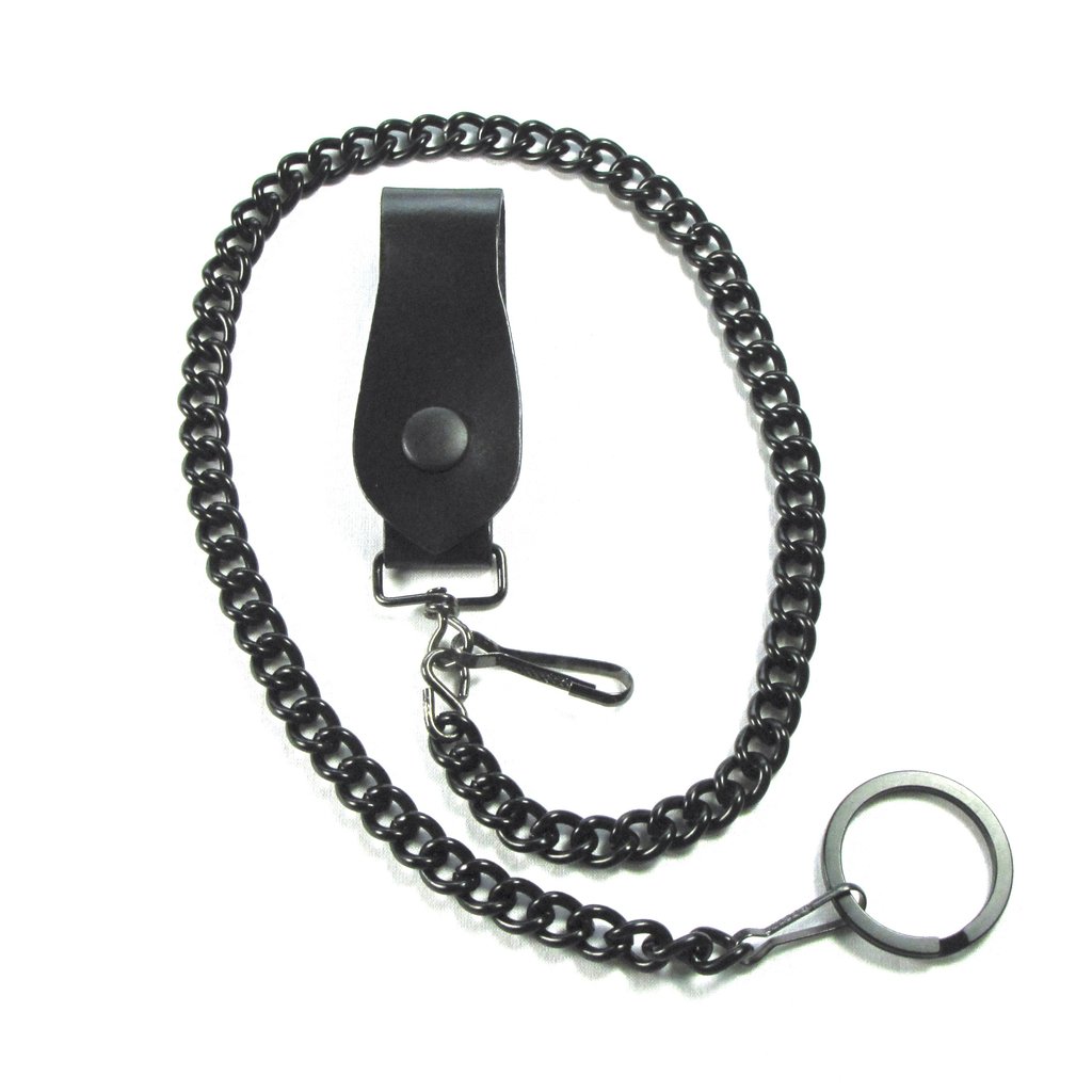Avainketju mustalla ketjulla, nahka. Ketjuosan pituus 45 cm, koko mitta nahkalenkin ja ketjun kanssa n. 64 cm. Nahkainen vyölenkki nepparilla max. 50 mm leveälle vyölle. Made in USA.