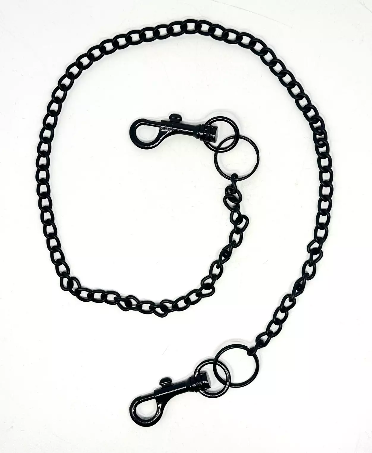 Avainketju, musta metalliketju. Ketjuosan pituus n. 72 cm, ketjun leveys n.10 mm. Molemmissa päissä papukaijahaka.