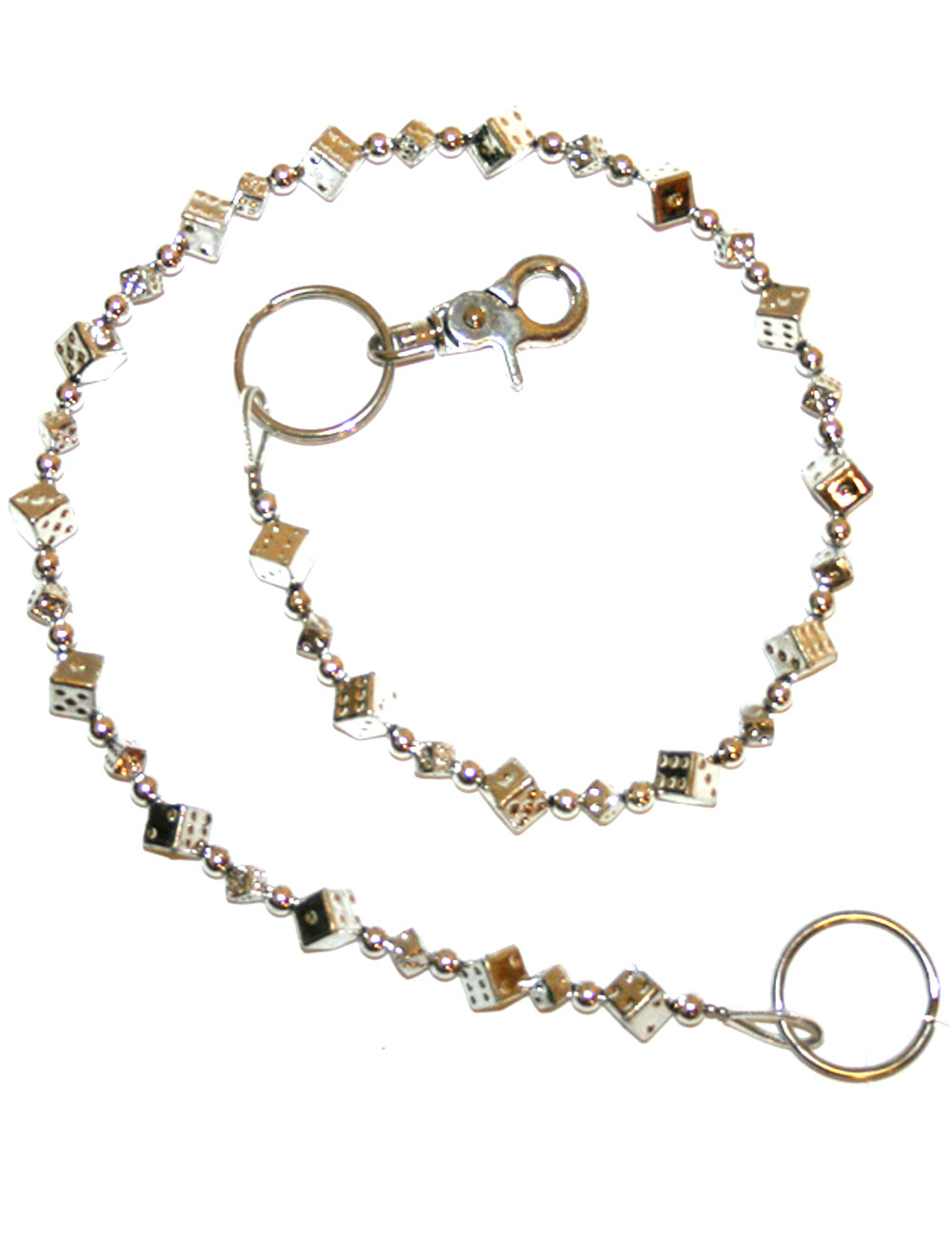 Avainketju, noppa, kromin värinen ketju pienillä nopilla ja palloilla, lisäksi lukko ja rengas. KETJUNPITUUS = 69CM