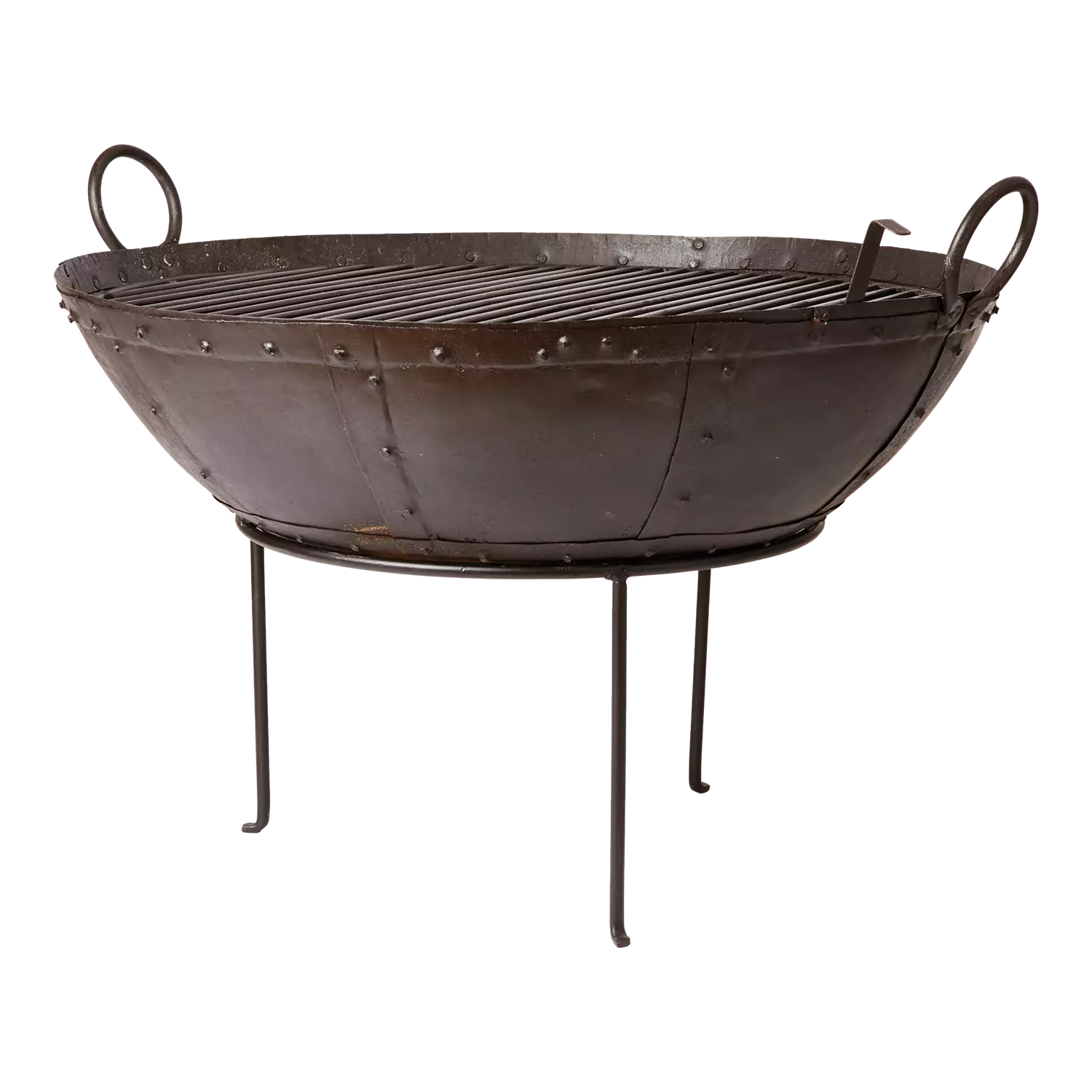 Barbeque Fire Basket. Mitat : Halkaisija 85 cm, korkeus jaloilla 48 cm, ilman jalkoja 38 cm. Paino 23 kg. Patinoitunutta metallia. Patinoituu käytössä lisää.