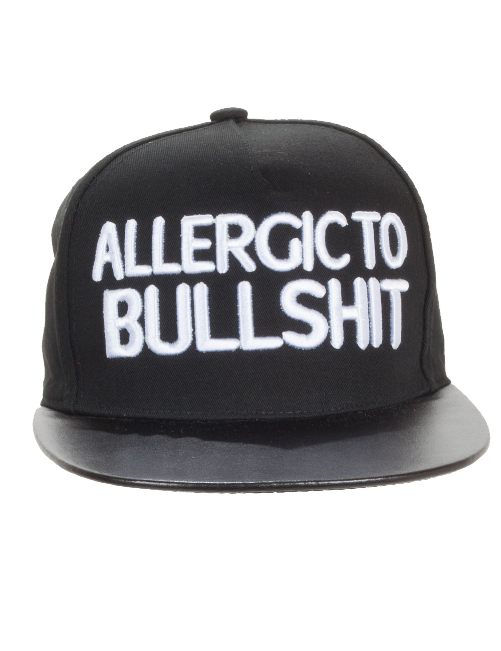 Baseball lippis, musta lippis valkoisella "allergic to bullshit" brodeeraus ja keinonahkalippa.