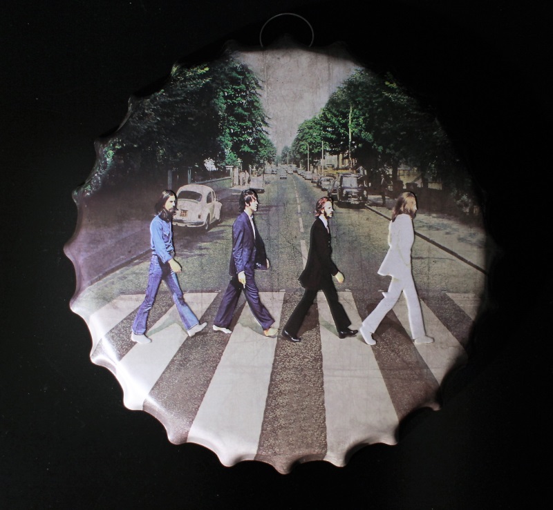 Beatles-korkki.Peltinen, korkinmuotoinen seinäkoriste Beatles-faneille ! Korkin halkaisija 40 cm, syvyys 4 cm ja paino n. 420 g