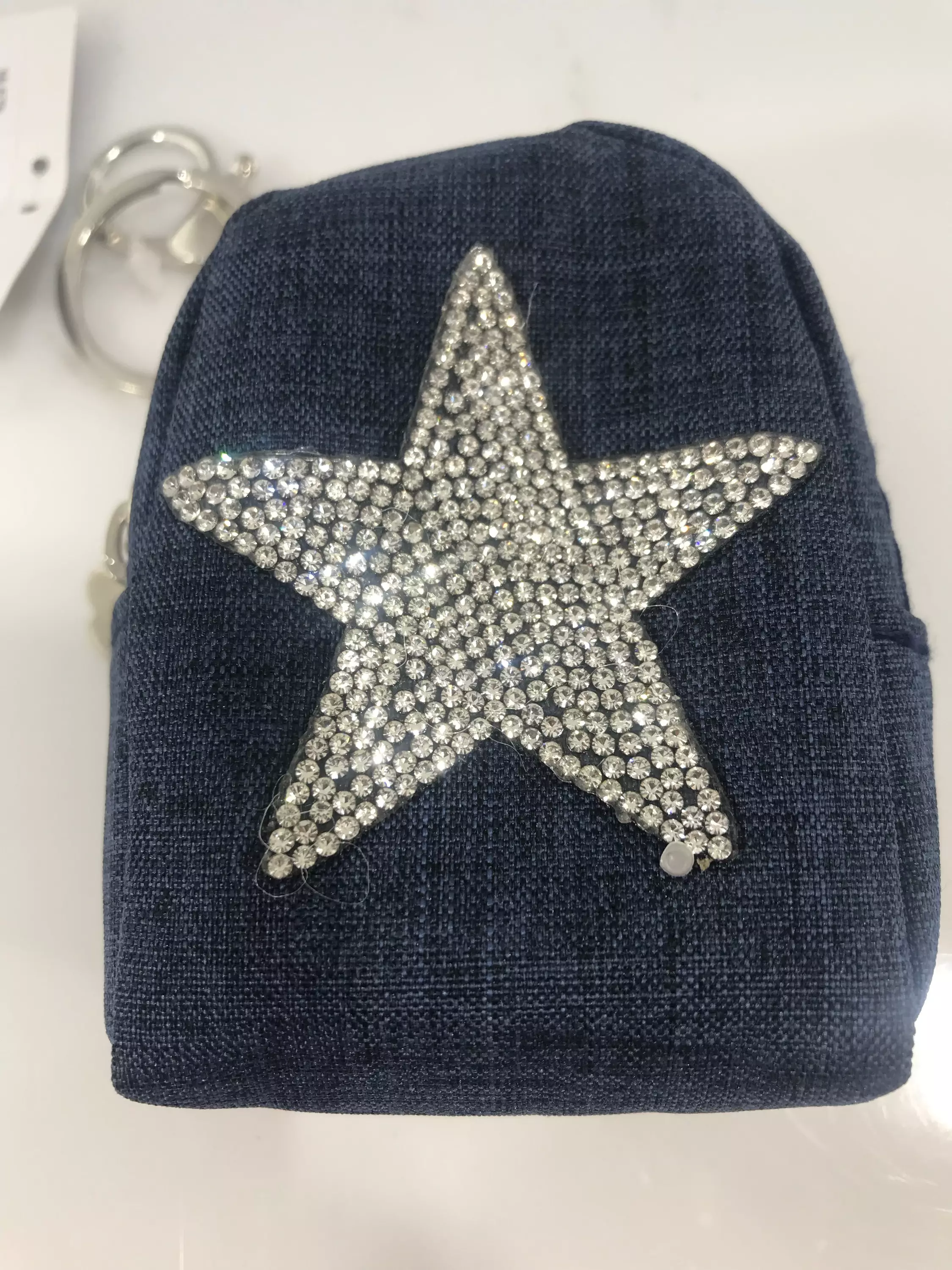 Bling-tähtikukkaro, sininen, avaimenperä. Sinisessä kangaskukkarossa vetoketjukiinnitys ja edessä kirkas koristetimanttitähti. Vetoketjussa krominvärinen, kukanmuotoinen metallivedin. Kukkarossa avaimenperäketju ja papukaijalukko, jolla kukkaron saa kätevästi roikkumaan esim. housujen vyölenkkiin.. Kukkaron mitat 6,5 cm x 4 cm x 10 cm.