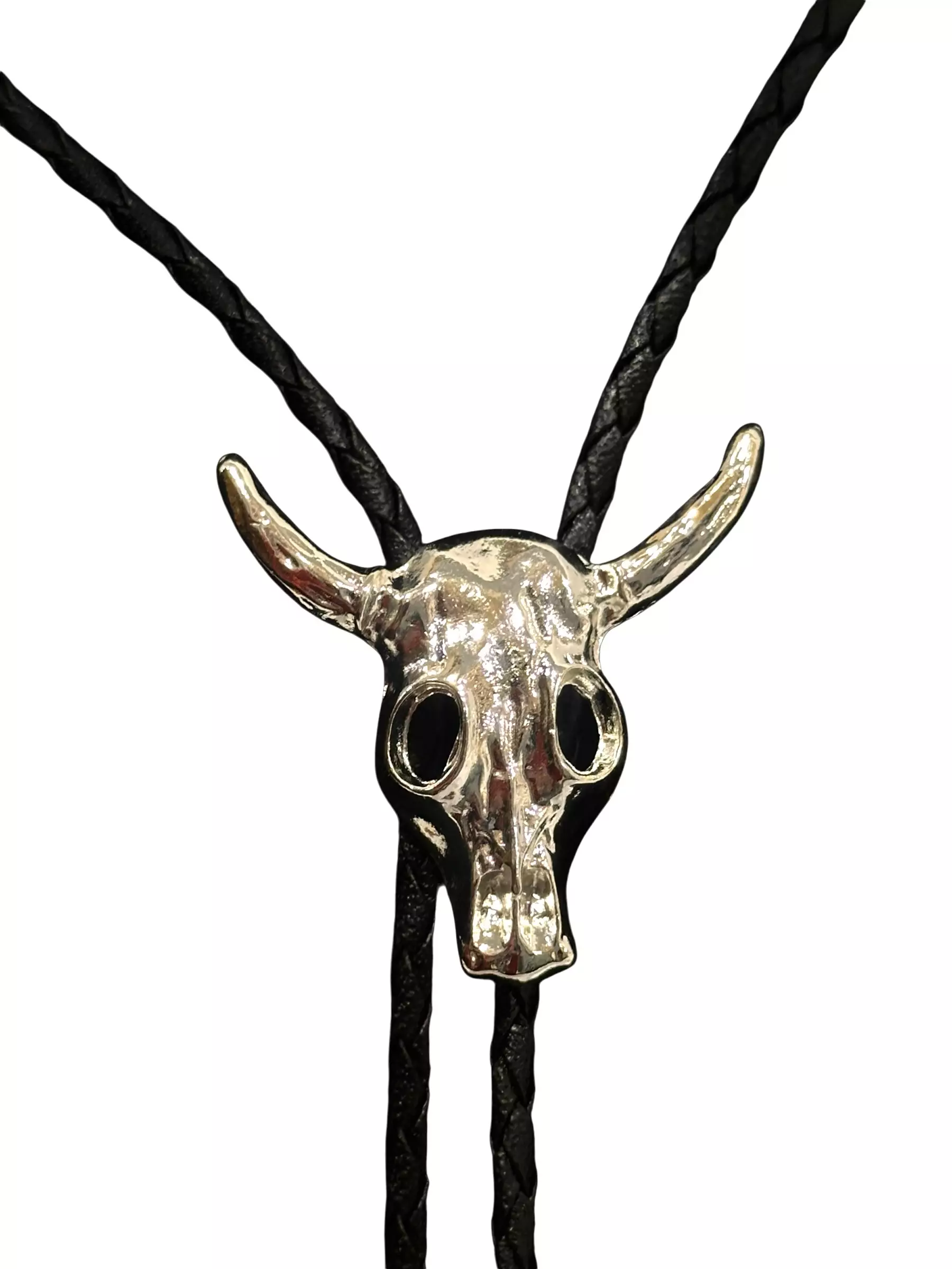 Bolo, Häränkallo. Punottu musta nyöri, jossa metallinen solki, ja nauhan päässä metallipäät. Häränpään mitat 43 x 40 mm, nauhan koko mitta on 93 cm.