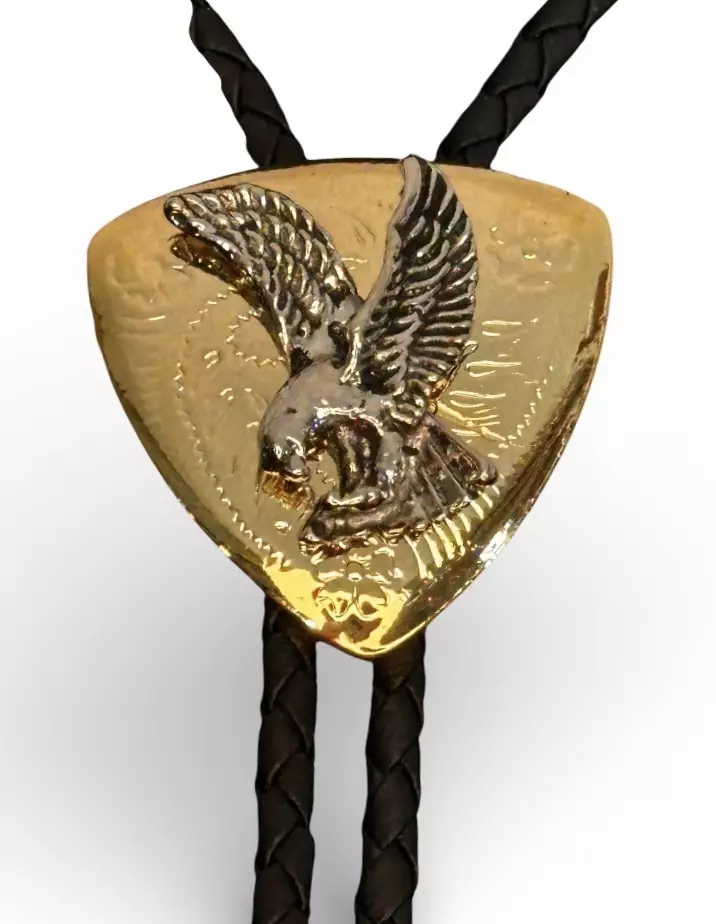 Punottu musta nyöri, jossa kullanvärinen metallinen solki ja nauhan päässä metallipäät. Soljessa hopeanvärinen kotka. Metallisoljen mitat n 40 x 40 mm, nauhan koko mitta on n. 90 cm.