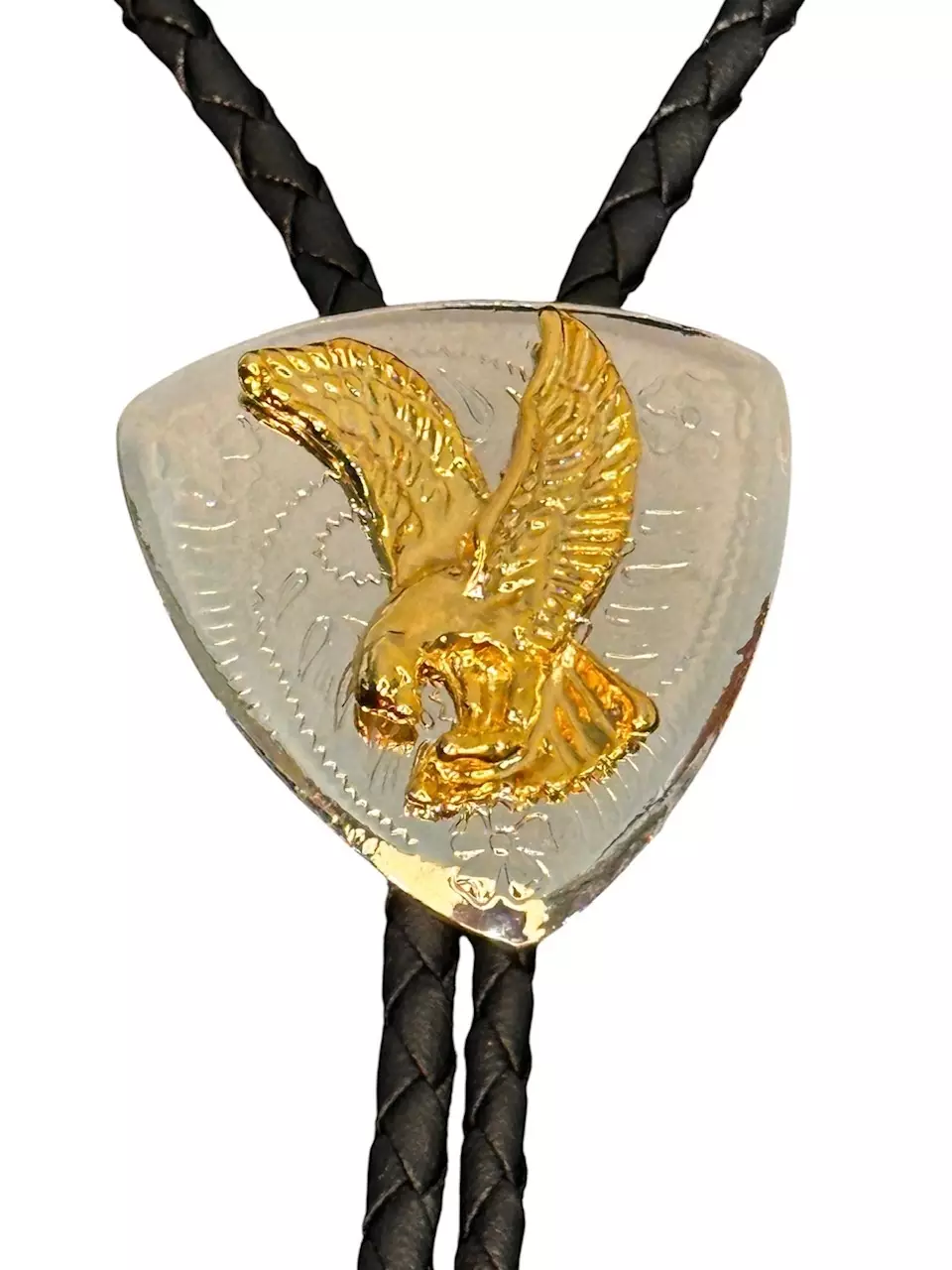 Bolo, Kultakotka. Punottu musta nyöri, jossa hopeanvärinen metallinen solki ja nauhan päässä metallipäät. Soljessa kullanvärinen kotka. Metallisoljen mitat n 40 x 40 mm, nauhan koko mitta on n. 90 cm.