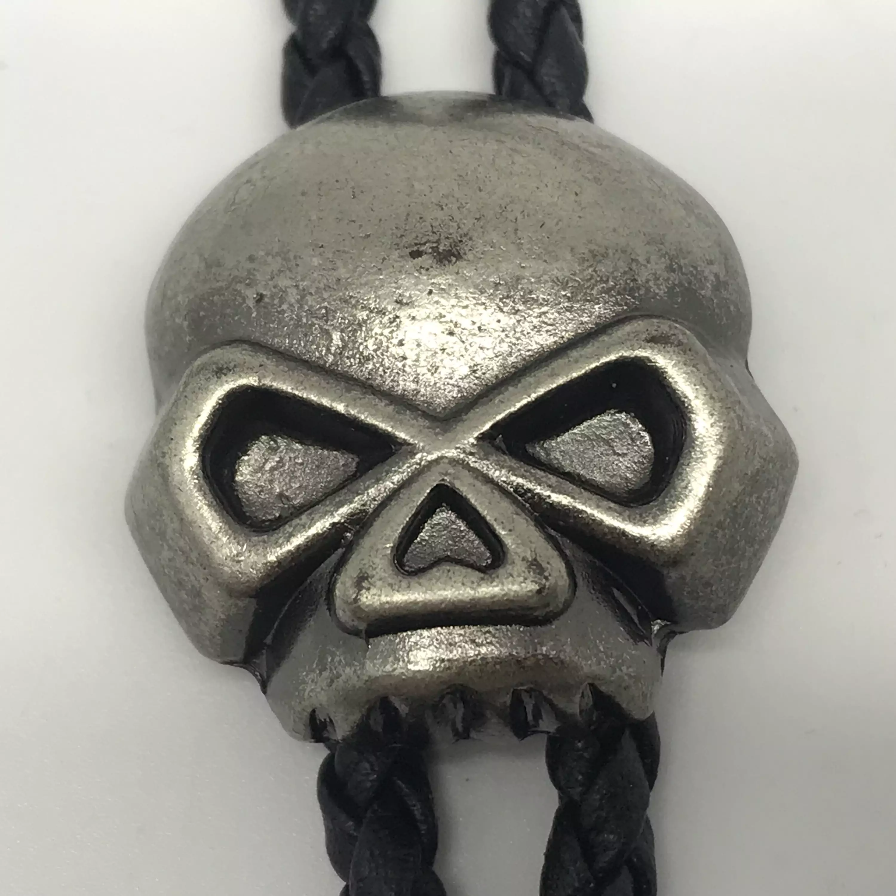 BOLO, metallikallo, hopea . Punottu musta nyöri, jossa metallinen, hopeanvärinen kallosolki ja nauhan päissä soljenväriset metallipäät.