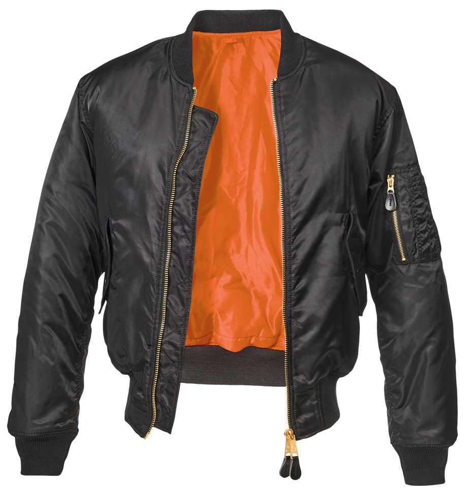 MA-1 Pilottitakki Musta. Brandit pilotissa on hihassa vetskaritasku ja edessä käsitaskut. Oransi vuori.