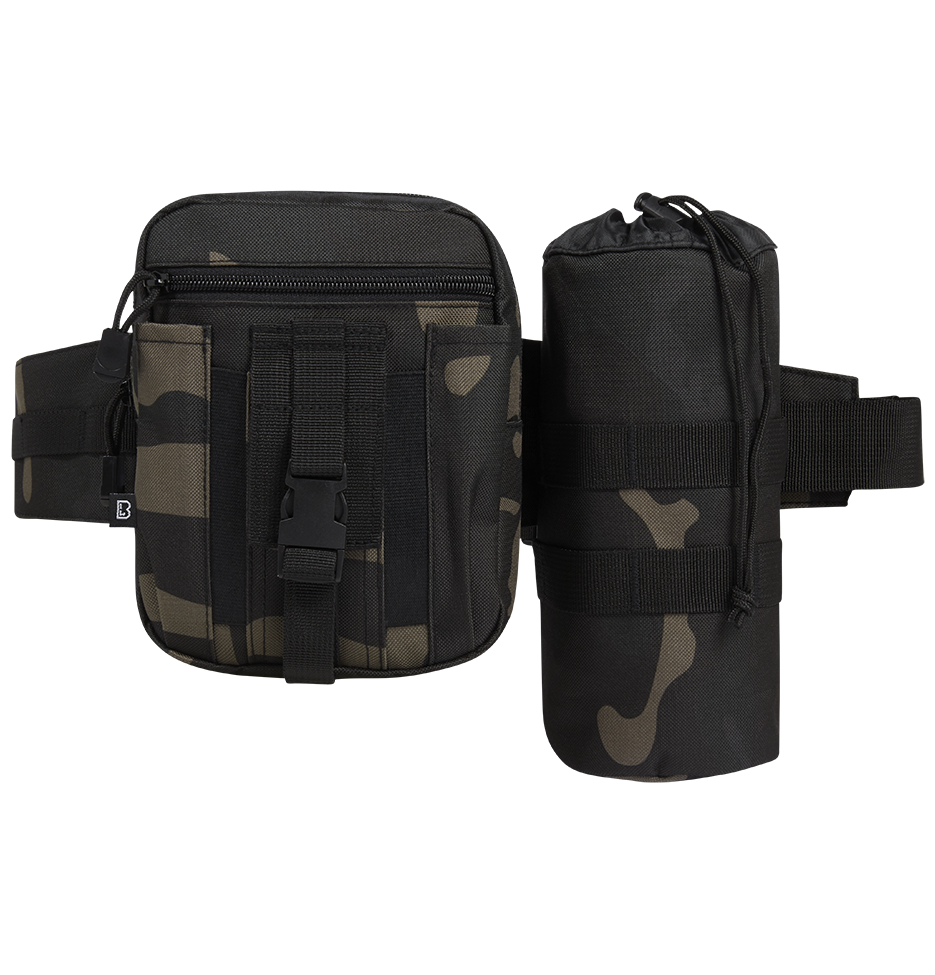 Brandit vyölaukku Allround, darkcamo. Näppäränkokoinen vyölaukku, joka pienestä koostaan huolimatta kätkee sisäänsä paljon säilytystilaa. Kiinteän vyölaukkuosan lisäksi laukkuun sisältyy irrotettava, kiristysnyörillä suljettava pullotasku, johon mahtuu 0,5-1 litran kokoinen juomapullo. Kiinteä laukkuosa on vetoketjullinen, ja lisäksi laukun etuosassa on pienempi vetoketjutasku pikkutavaroille. Pikkutaskun edessä on lisäksi soljella suljettava, läpällinen pystytasku, jonka sivuosat ovat joustavat ja mahdollistavat säilytyksen esim. pienikokoiselle kännykälle tai monitoimiveitselle. Edessä on myös kaksi lokeroa kynille, kynälampulle tai työkaluille. Kiinteän laukkuosan mitat 15 cm x 19 cm x 7 cm. Vyöosan leveys 4 cm ja maksimipituus 1,20 m.