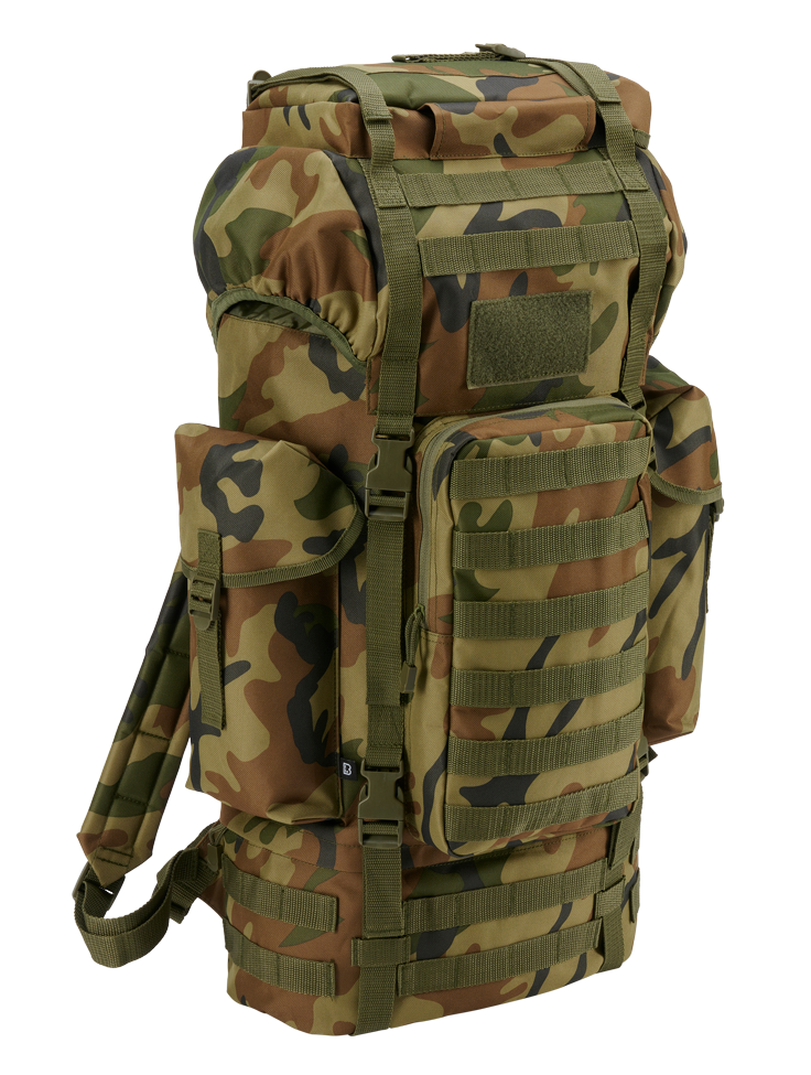 Brandit Woodland Molle Combat reppu/rinkka. Laukun mitat 40 cm x 67 cm x 25 cm. Repun tilavuus 66 litraa. Topatut olkahihnat tuntuvat miellyttäviltä, vaikka repussa olisi enemmänkin painoa. Paljon yksityiskohtia, tarranauhoja, lenkkejä, taskuja...