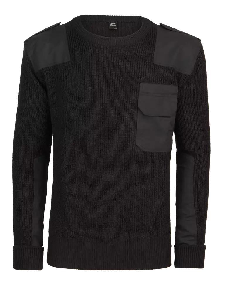 BW Pullover, Musta. Brandit-neule paikkatehostein. Neuleen materiaali 100 % akryyli, paikkakankaat 100 % puuvilla.