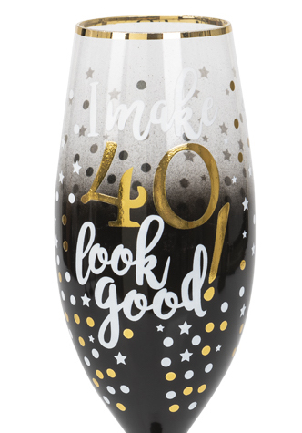 Shamppanja-lasi 40 vuotta. 40 look good! Kannustava lahja vuosipäiväänsä viettävälle. Lasin korkeus 24 cm, halkaisija leveimmältä kohdalta 60 mm, lasin suusta 50 mm.