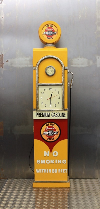 Vanhan bensapumpun mallinen, upean värinen Chevrolet-kaappi. Käsinmaalattu katseenvangitsija. Kaapin yläosa toimii valaisimena ja yläovessa on kello. Harvinainen ja hieno sisustusyksityiskohta. Materiaali MDF-levyä. Koko 41 x 24 x 166 cm, paino n. 15 kg.