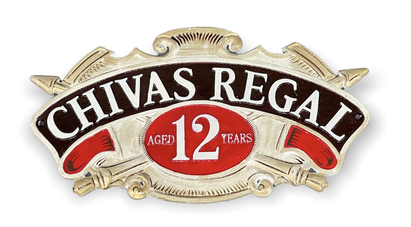 Chivas Regal-valurautakyltti 35 x 18,5 cm. Tyylikkäästi maalattu valurautainen koristekyltti ansaitsee hyvän paikan seinältä. Kyltin molemmissa päissä reiät ruuveja varten (kiinnitysruuvit eivät sisälly).