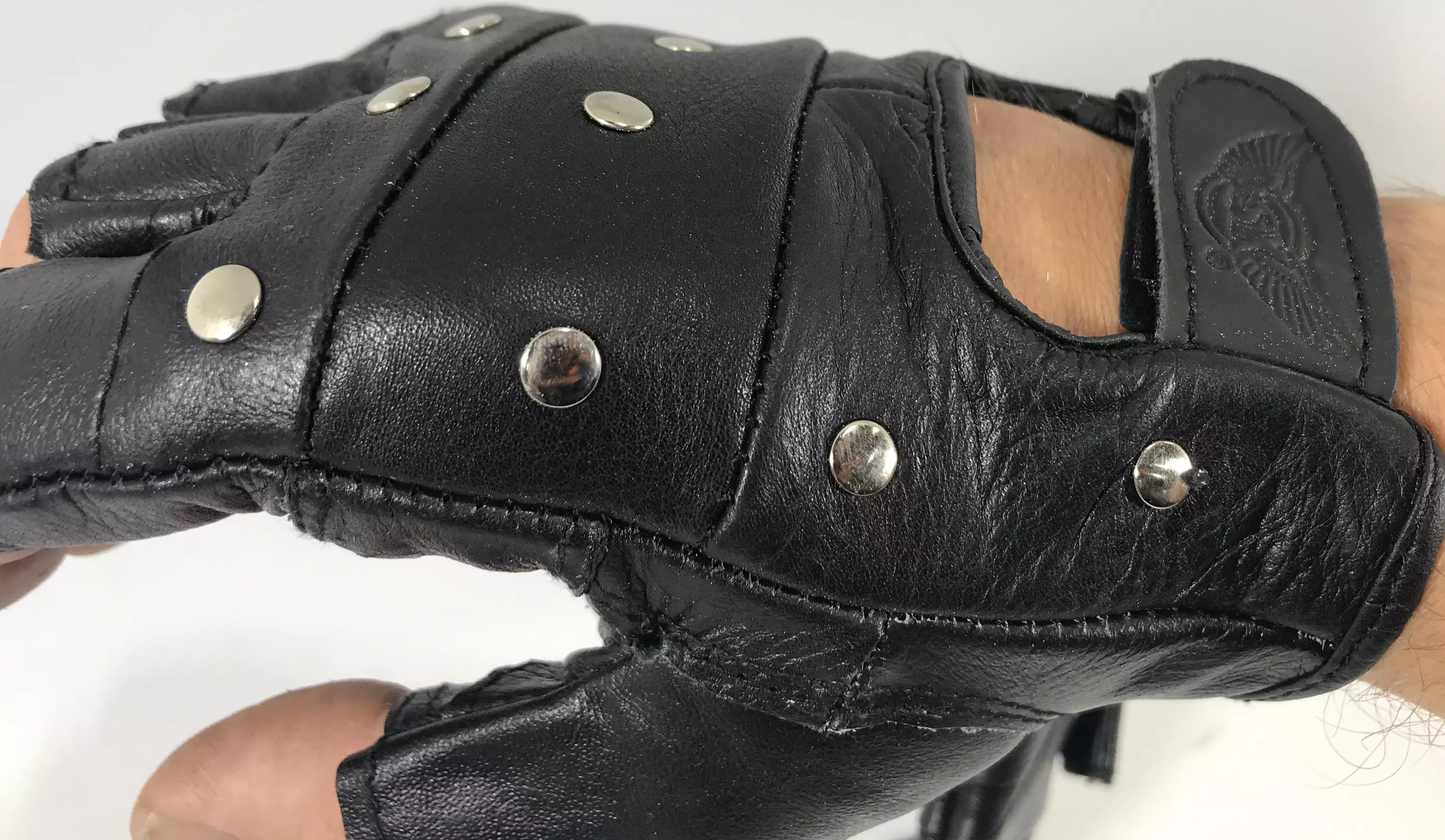 Chopper hanska. Tasainen niitti. Mustaa nahkaa sisä ja päälipuolella. Tarra / velcro kiinnitys.
