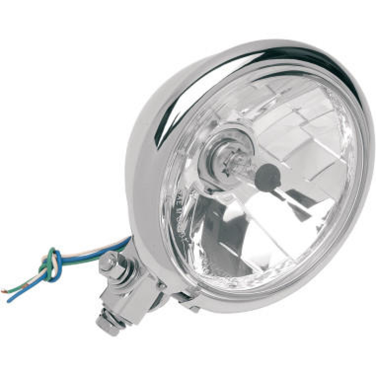 Smooth chrome housing with diamond-style clear lens and reflector optics Matching finish mounting block Available with clear or blue tint lens with H4 P43T bulb Blue tint lens provides a whiter, brighter headlight beam Replacement bulb available separately