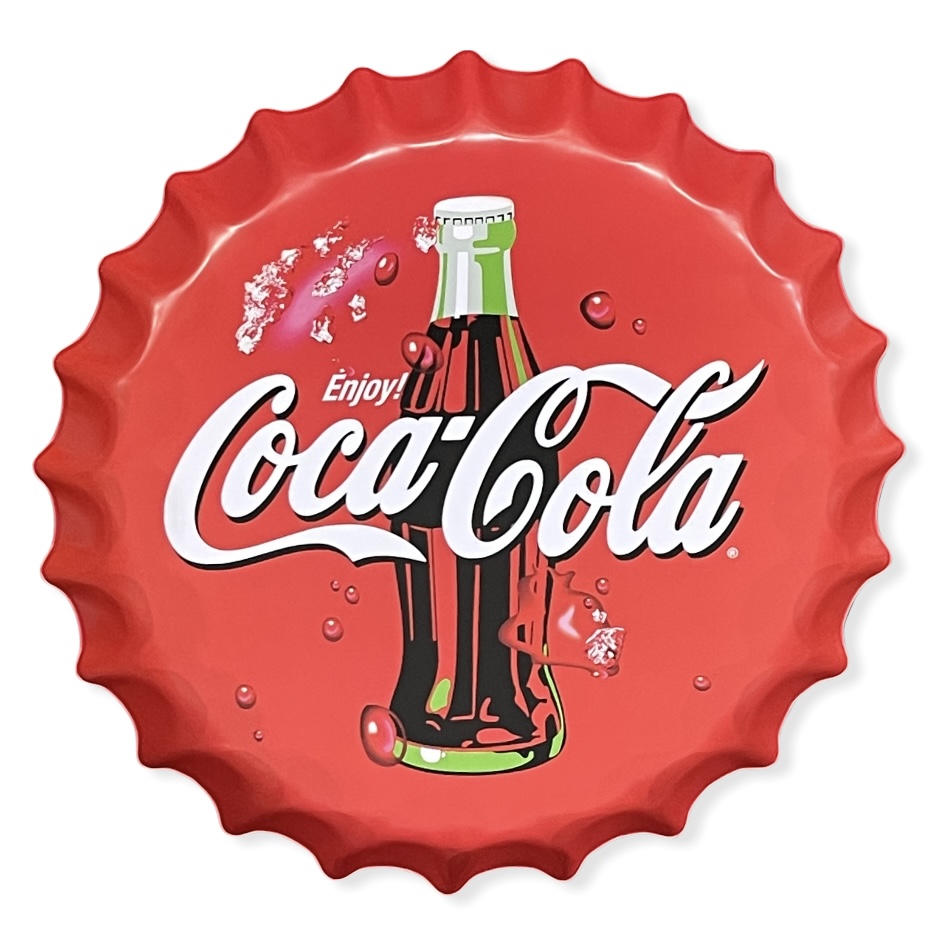Coca Cola-korkki/tarjotin, halk. 40 cm. Peltinen, korkin näköinen tarjotin, joka näyttää hyvältä myös seinähyllyssä. Halkaisija 40 cm, ja reunan korkeus ylettyy 4 cm:n korkeudelle suoraan ylöspäin mitattuna.