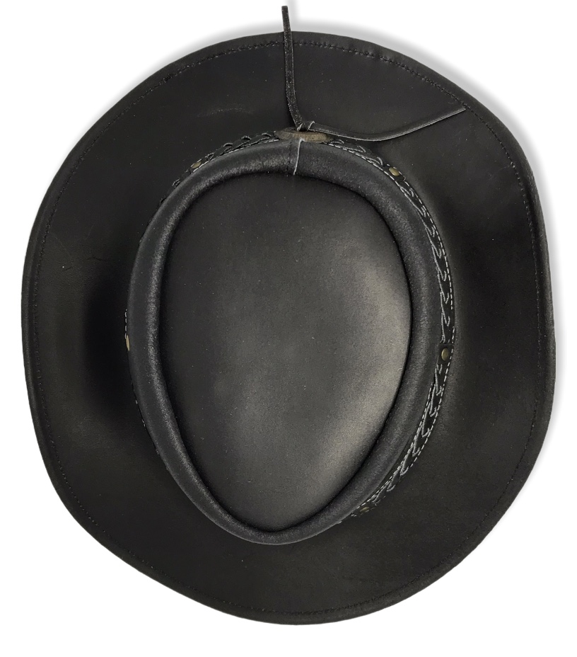 Nahkahattu, musta nahkahattu. Reutalanka reunassa joka helpottaa muotoilua. Punotun hattunauhan mallit vaihtelevat hieman toimitus erän mukaan.