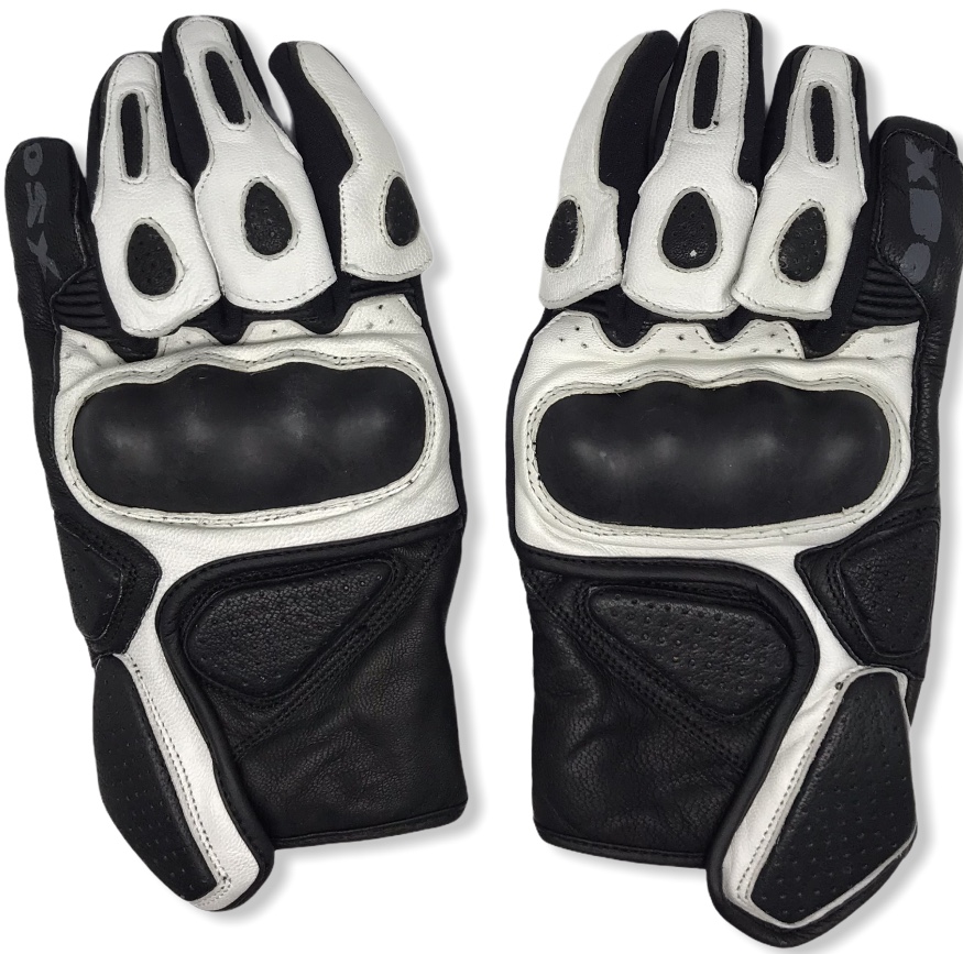 Cyber-ajohanska, nahkaa. Mustavalkoinen ilmastoitu kesähanska hyvillä ajomukavuuksilla: Rystyssuojat, liukuesteet kämmenpuolella, joustavuus, kiristyksensäätö ranteessa, hengittävyys, tuulenpitävyys, sateenkestävyys...